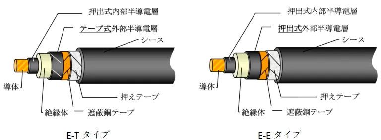 E-T | 押出式 (E) | テープ式 (T) | 絶縁体上に外部半導電テープを巻回。端末処理が容易。 |