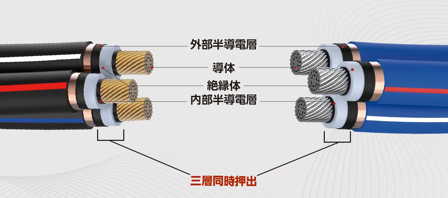 E-E | 押出式 (E) | 押出式 (E) | 3層を同時押出。界面が一体化し、耐水トリー性に優れる。 |