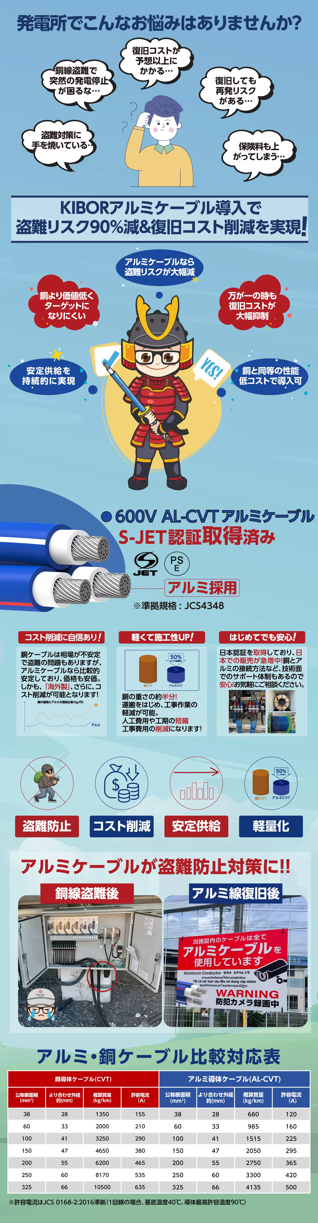 ●消防用ケーブル(FP-C):800℃・30分間の通電性能が要求されるため、融点が660℃のアルミ導体は使用不可です。 ●太陽光発電用1500V直流ケーブル(PV-CQ):電気設備技術基準で「導体は銅であること」と規定されているため、アルミ導体は適用できません。ただし、交流用や低圧直流用ケーブルでは問題なく使用できます。