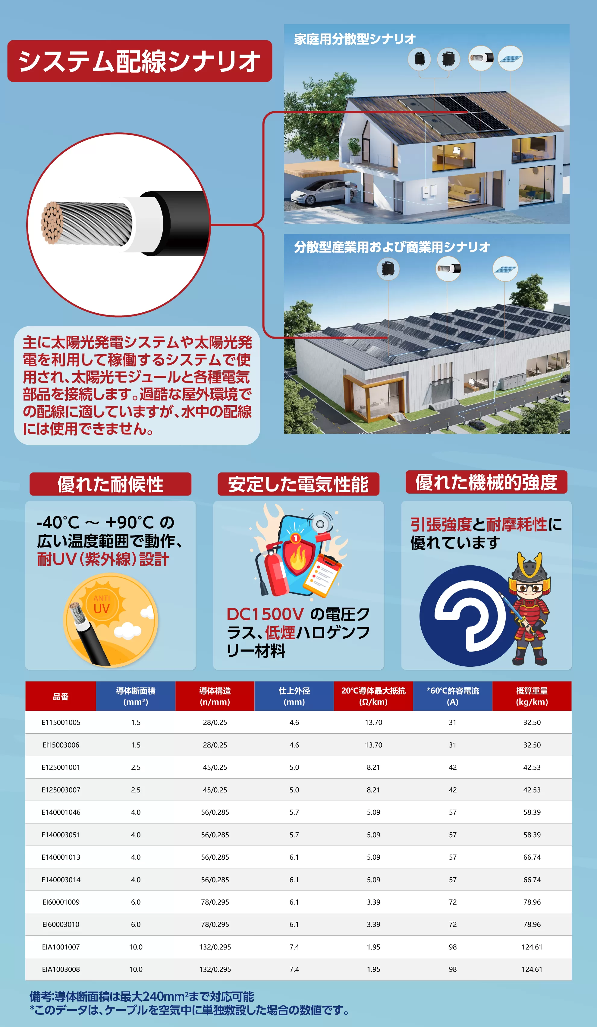 H1Z2Z2-Kは欧州規格EN 50618に準拠した太陽光発電専用ケーブルで、卓越した耐候性、優れた難燃性、そして高い紫外線耐性を兼ね備えています。25年以上の長期使用を想定した設計思想に基づいて開発されており、メガソーラーから一般住宅まで、様々な太陽光発電システムの厳しい設置環境において、高い信頼性と耐久性を発揮します。