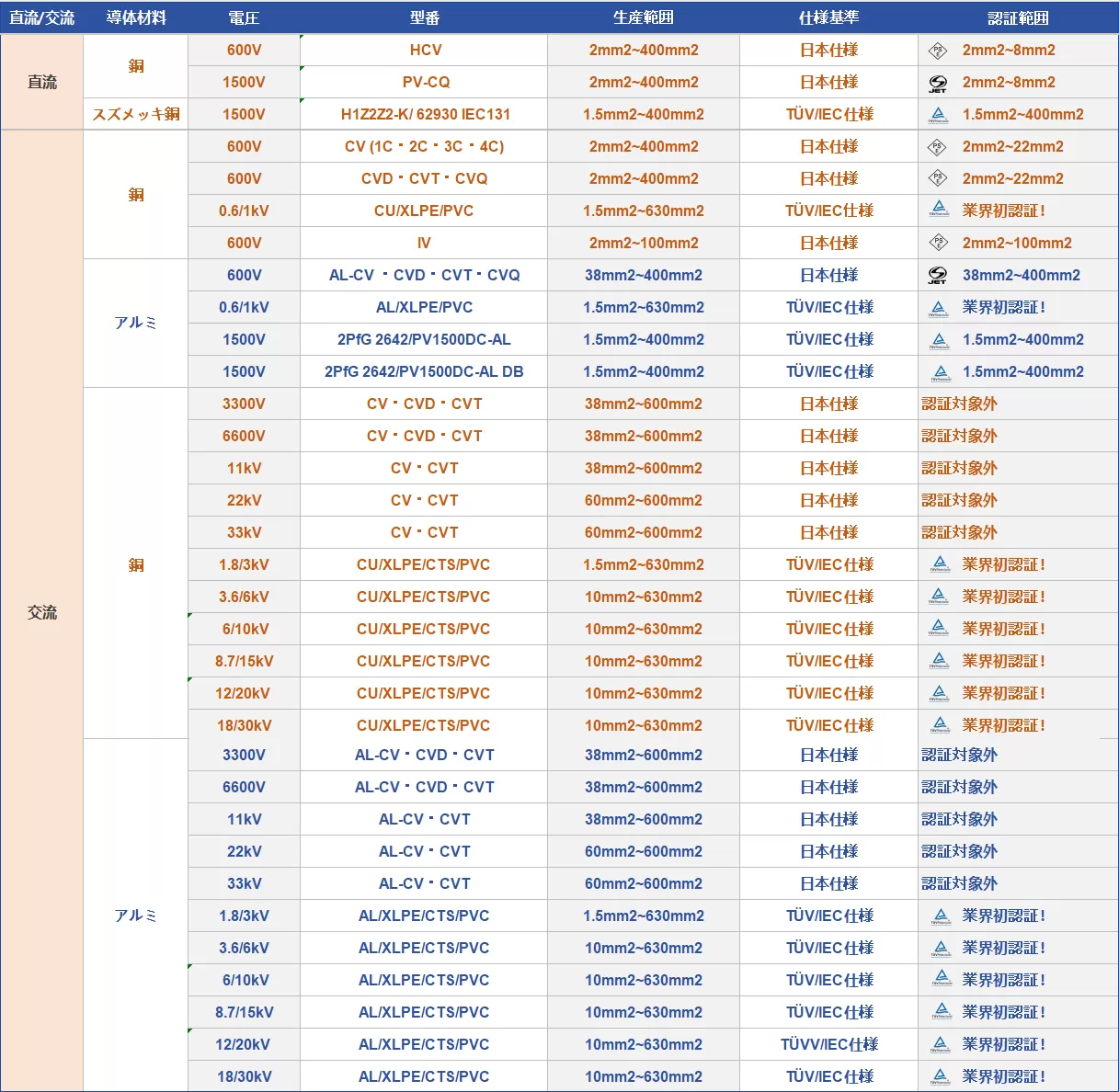 高圧アルミ・銅ケーブル(3300V/6600V/11kV/22kV/33kV)は、大規模太陽光発電システムや産業用電力設備向けに設計された電力伝送用ケーブルです。アルミ導体は軽量でコスト効率に優れ、盗難防止にも効果的。銅導体は高い導電性と信頼性を実現し、特に高効率が求められる場面に適しています。高電圧環境下でも安定した送電を可能にし、システム全体の効率向上と長期的な信頼性に貢献します。