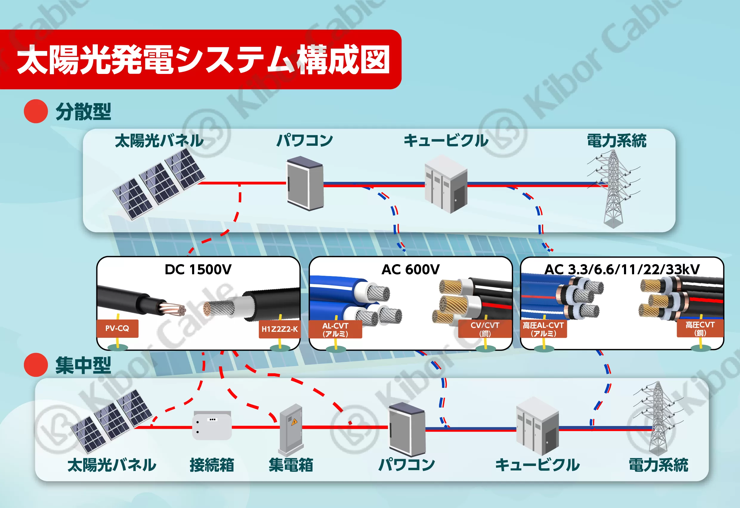 Kibor Cableは、システムの信頼性と経済性の両立を追求し、太陽光発電システム向けに多様なケーブルを製造しております。太陽光発電システムで広く採用されているDC/ACケーブルを提供しています。近年、銅価格の高騰を背景に、転売を目的とした銅線ケーブルの盗難事件が相次いでおり、特に太陽光発電所が標的になりやすい状況です。これは、発電所に銅線ケーブルが多用されていることに加え、郊外立地で人目につかず、基本的に無人であることが窃犯に狙われやすい要因となっています。こうした課題に対し、当社ではアルミ線(「AL-CVT」)を採用した盗難対策ソリューションを提供。さらに、50kW以上の大規模システム向けには、高圧ケーブル(銅/アルミ)も取り扱っており、発電効率の向上とコスト削減に貢献します。